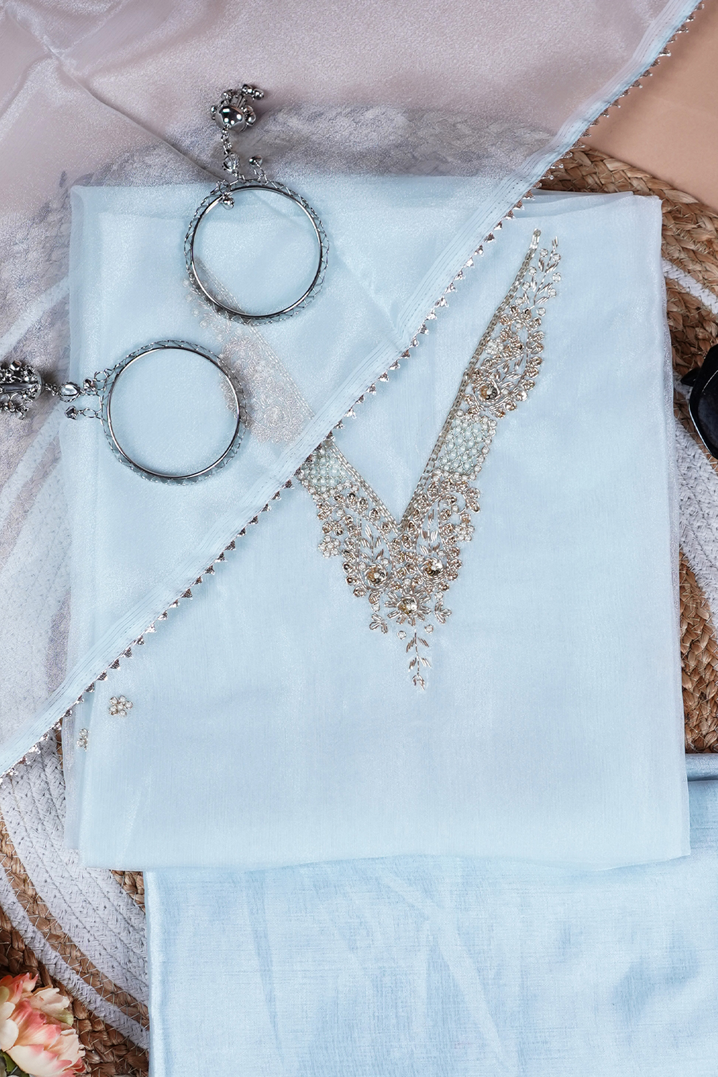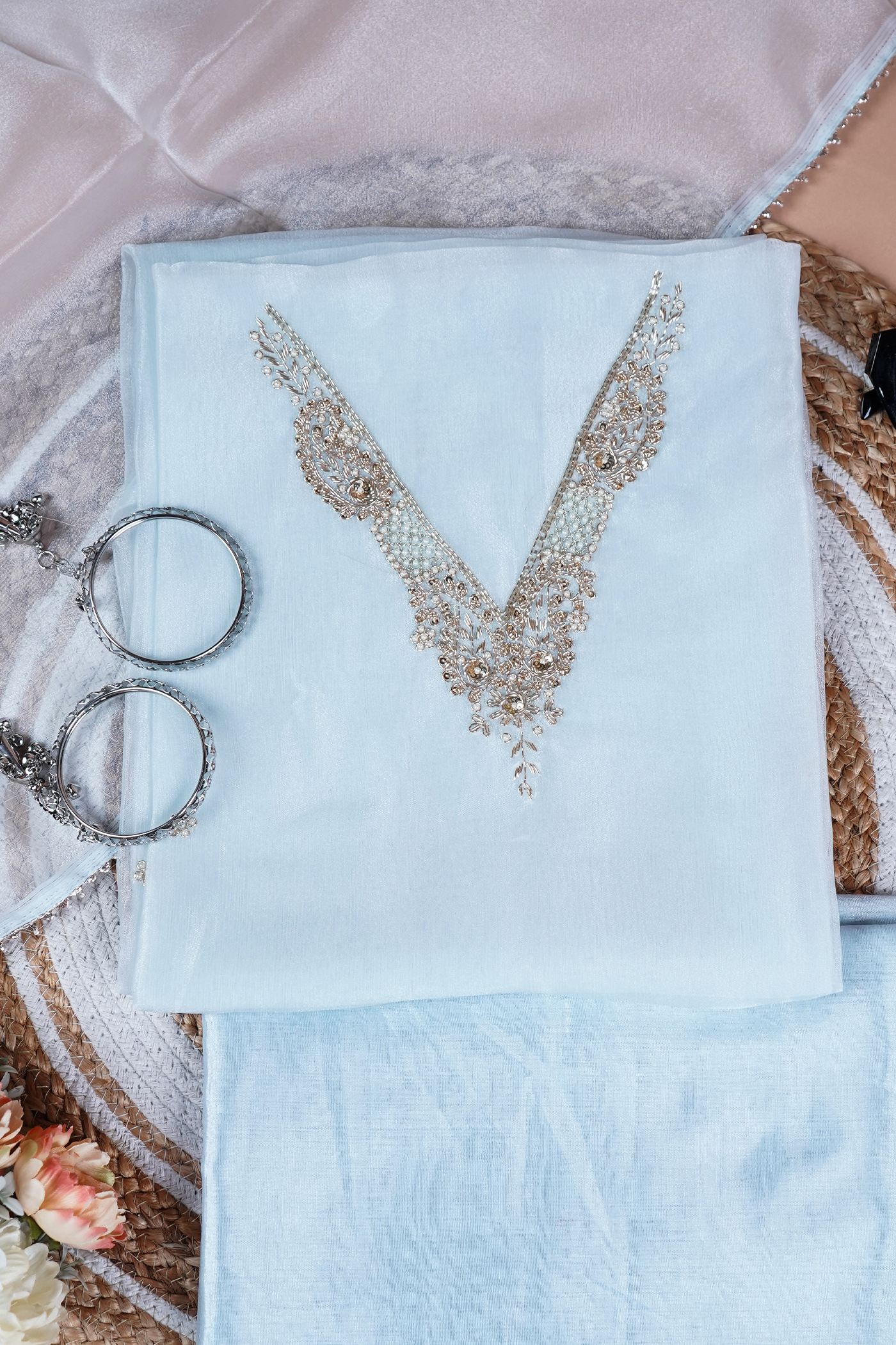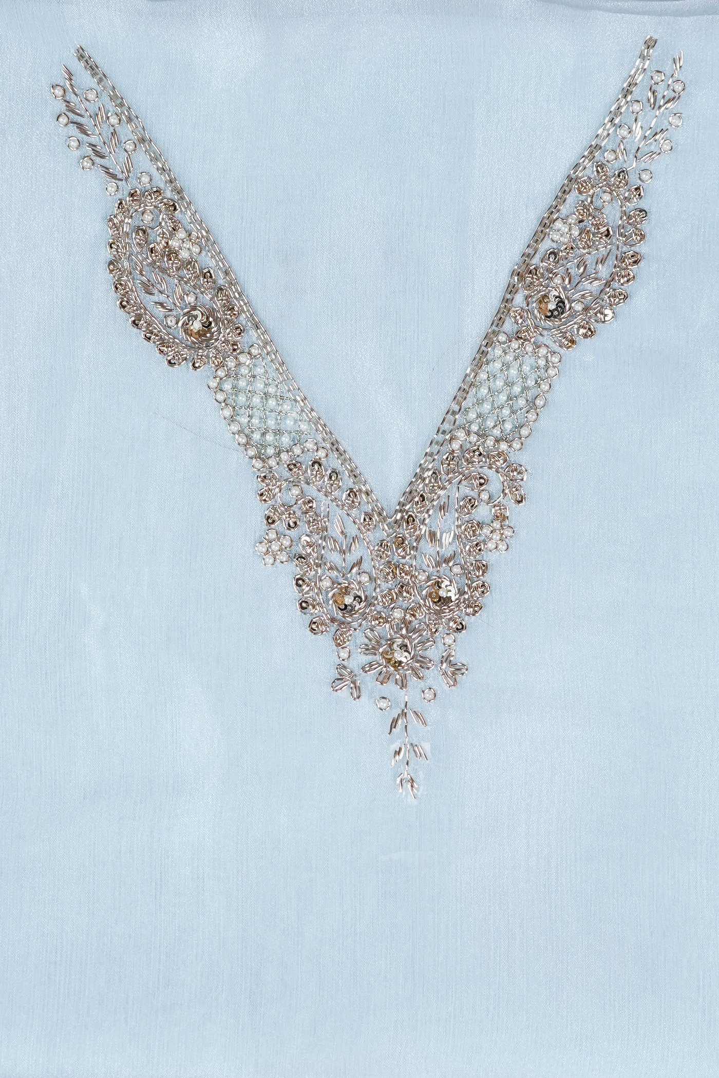 This sky blue unstitched suit features a sophisticated V-neck adorned with intricate zardozi embroidery and delicate pati gota work. Designed for customization, it allows you to create a personalized ensemble that highlights traditional craftsmanship with a modern touch. Perfect for those who appreciate detailed artistry and elegant, versatile attire.