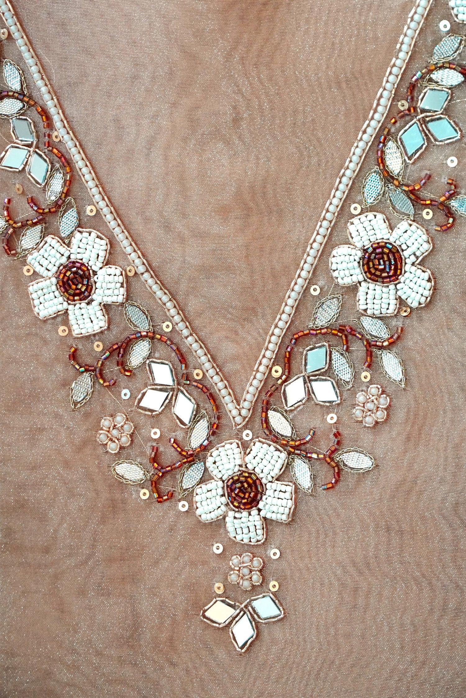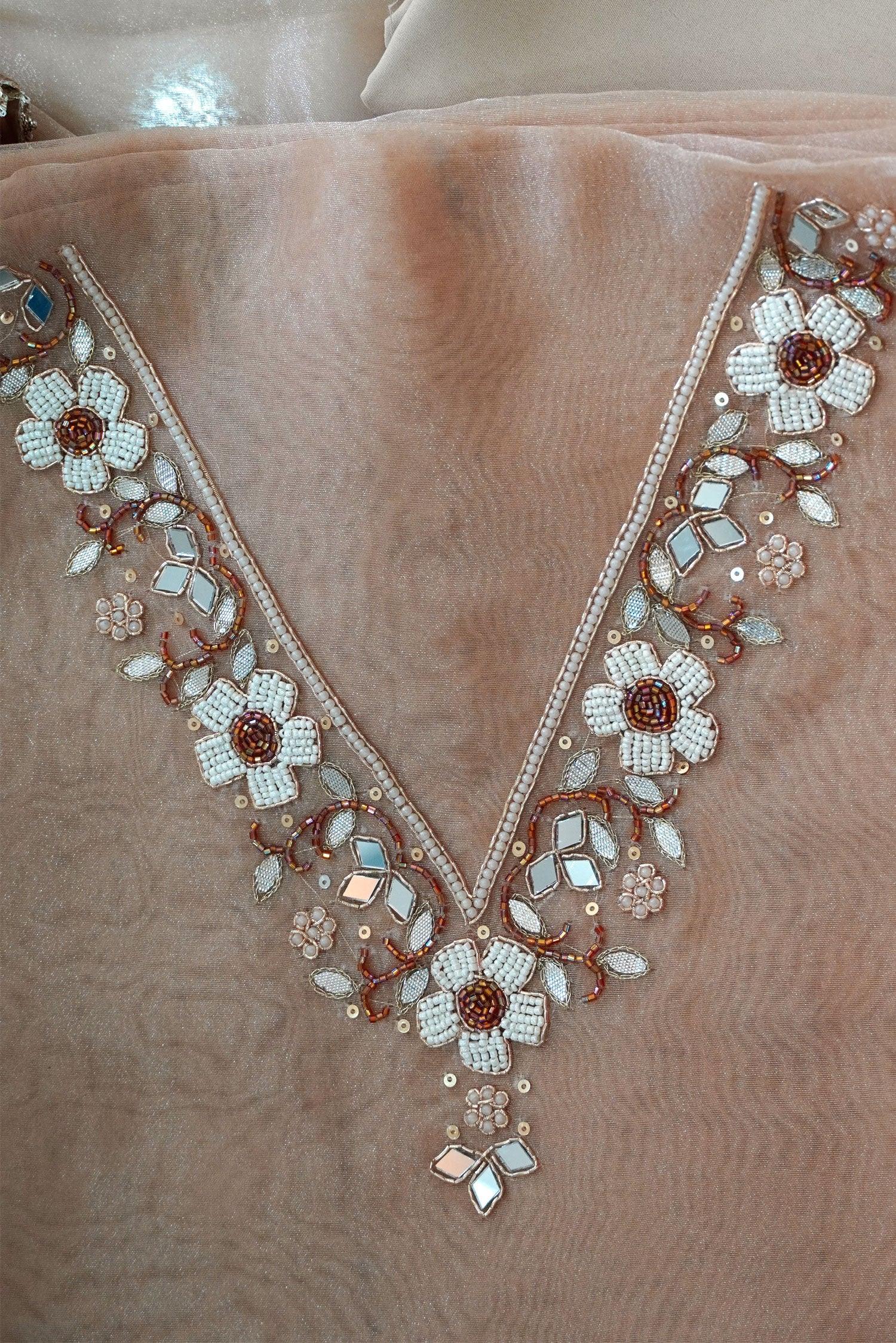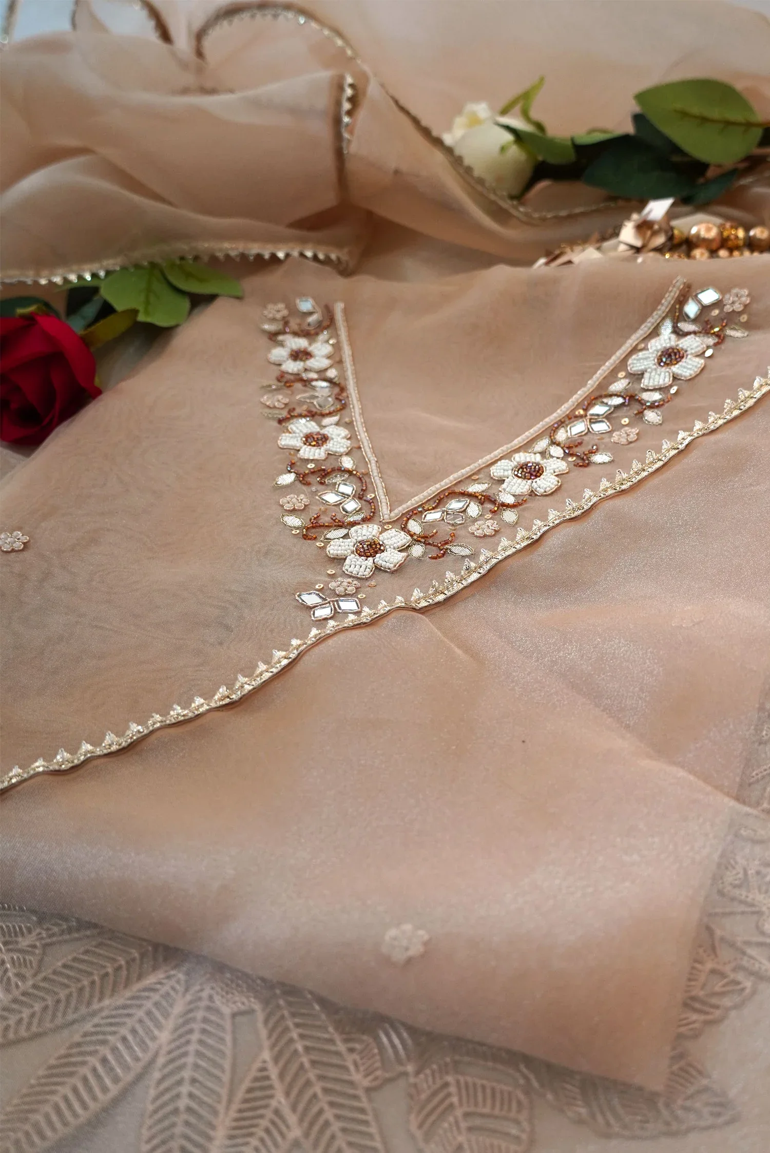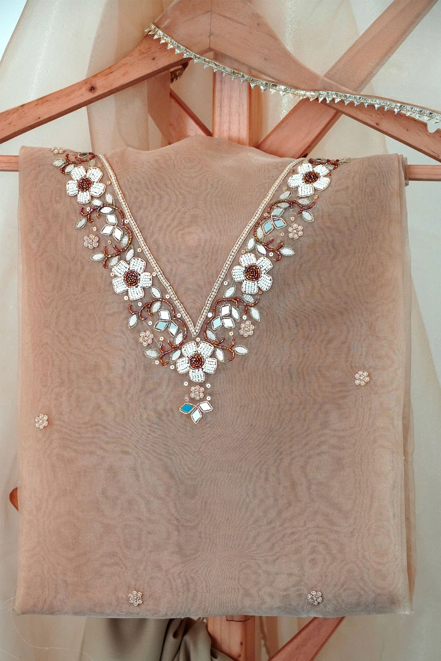 The Caramel Pearl Mirror Work Organza Unstitched Suit Set offers a luxurious blend of delicate organza fabric adorned with intricate pearl and mirror embellishments. This unstitched set provides the flexibility to tailor a personalized fit while showcasing elegant shimmer and texture. Its warm caramel tone enhances sophistication, making it an excellent choice for creating custom ethnic attire suited for special occasions.