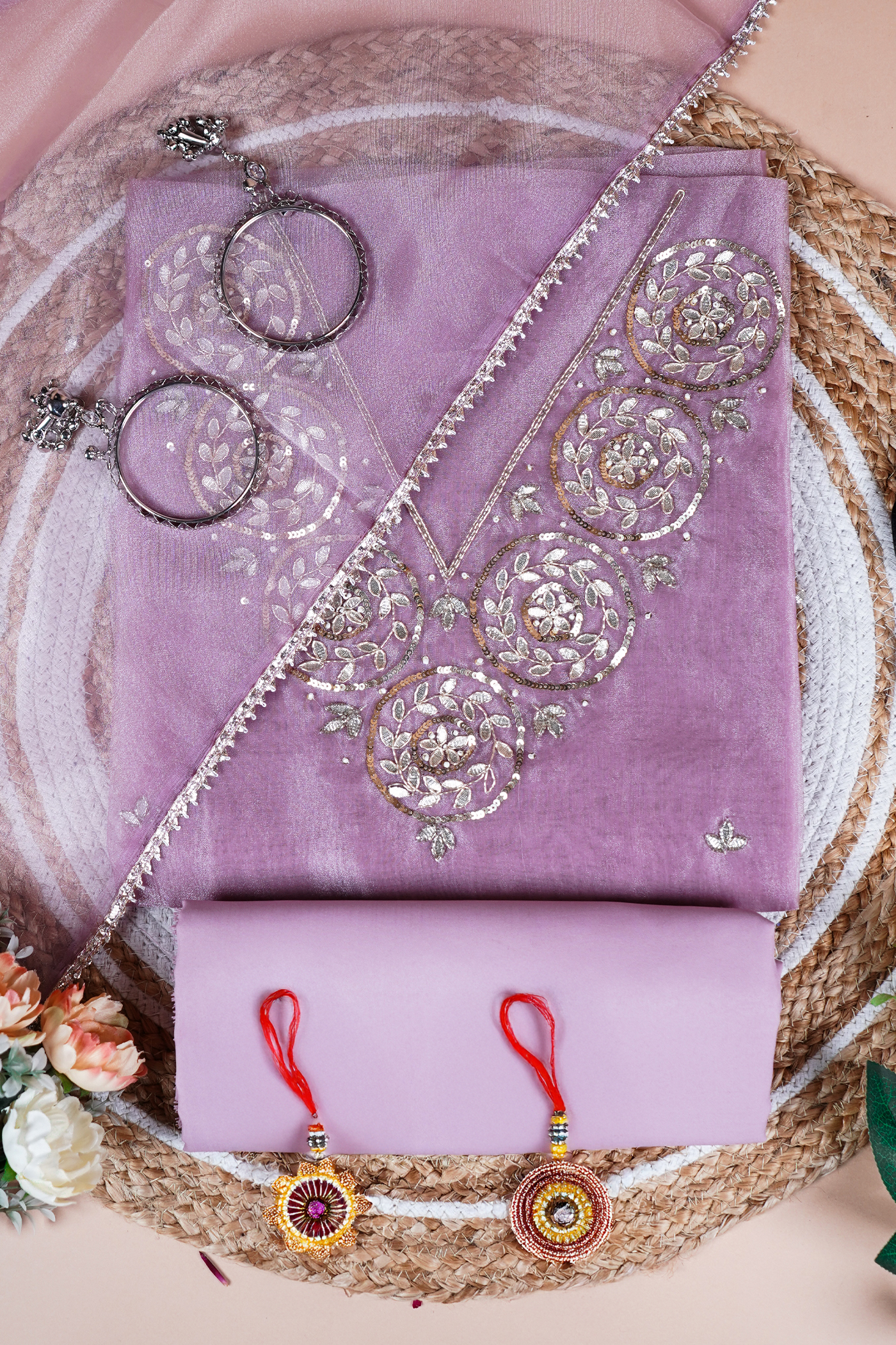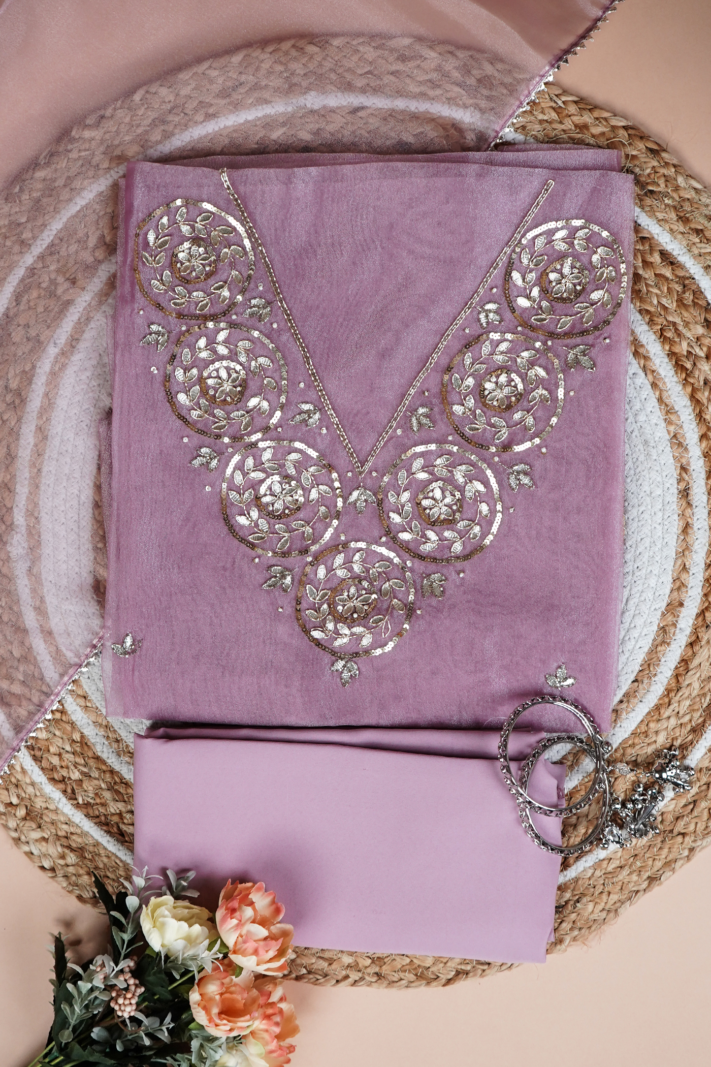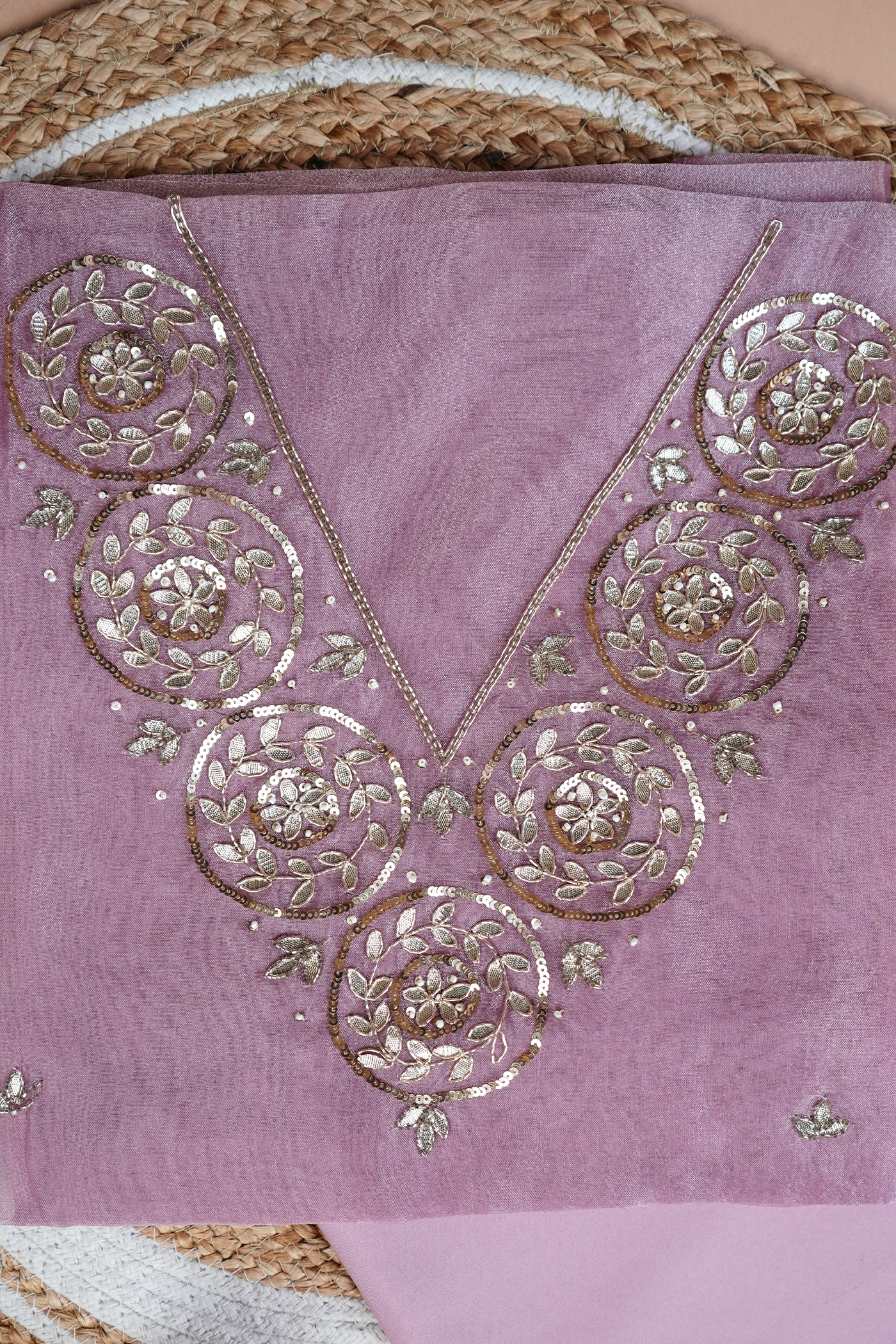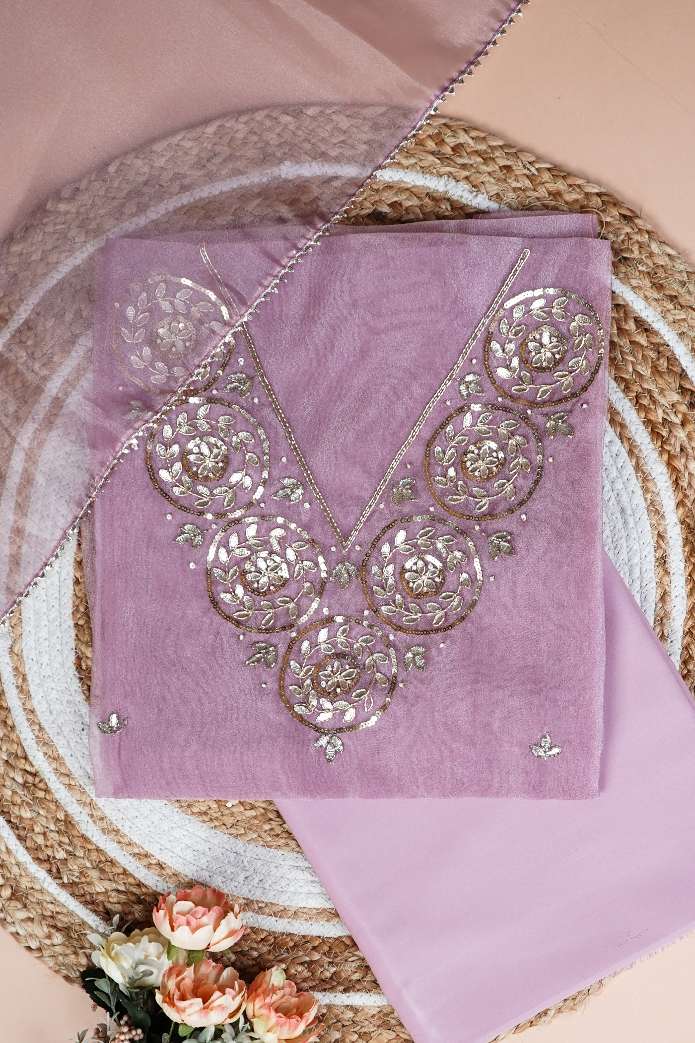 The Rosy Noor Gota Patti Unstitched Suit Set showcases refined craftsmanship with its delicate Gota Patti embellishments, offering a sophisticated foundation for custom tailoring. This unstitched fabric set provides flexibility to create a perfectly fitted outfit, blending traditional artistry with contemporary style. Ideal for special occasions, it ensures a graceful and elegant appearance that reflects expert design sensibilities.