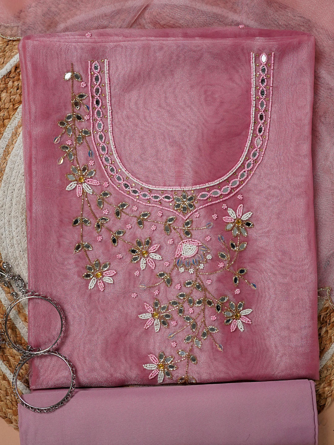 Pink Petal Hand Embroidered Unstitched Suit Set with Beads & Mirror Work